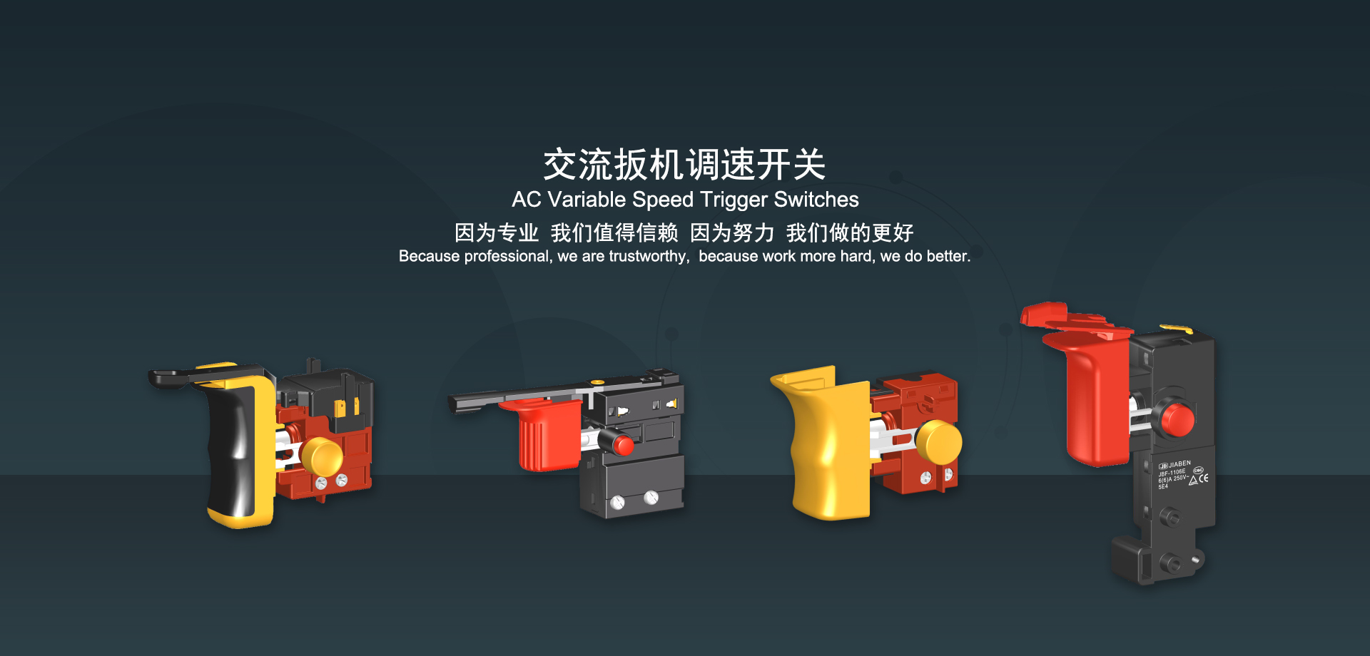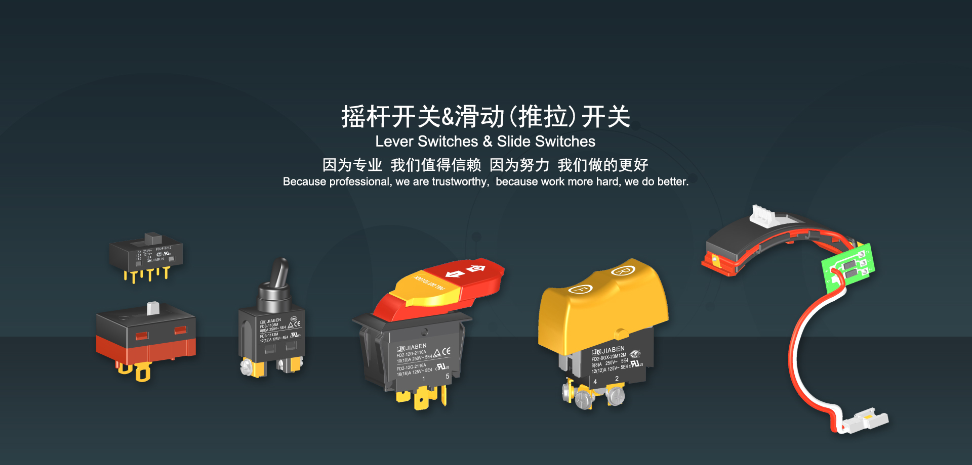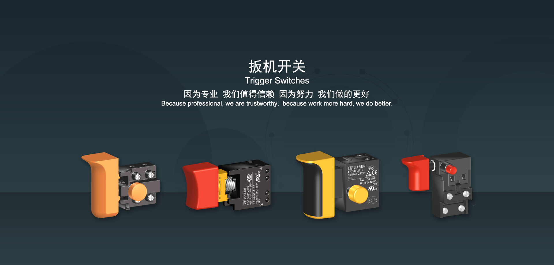 浙江佳奔電子有限公司始建于1986年,坐落于浙江省樂(lè)清市虹橋鎮(zhèn)東電子信息產(chǎn)業(yè)園內(nèi),現(xiàn)有職工700多人,資產(chǎn)總額超3億元。公司主要經(jīng)營(yíng)“JIABEN”牌微動(dòng)開(kāi)關(guān)、蹺板開(kāi)關(guān)、按鈕開(kāi)關(guān)、扳機(jī)開(kāi)關(guān)、調(diào)速開(kāi)關(guān)和電位器開(kāi)關(guān)等各類(lèi)交、直流器具開(kāi)關(guān)和各類(lèi)交、直流線(xiàn)路板模塊等產(chǎn)品,主要應(yīng)用于交、直流電動(dòng)工具、電動(dòng)園林工具、清潔器具、家用電器和小型機(jī)床等行業(yè),是集產(chǎn)品設(shè)計(jì)、研發(fā)、制造、銷(xiāo)售和服務(wù)于一體的國(guó)家高新技術(shù)企業(yè)。JIABEN was founded in 1986, located in East Electronic Information Industry Park, Hongqiao Town, Yueqing City, Zhejiang Proviance, existing staff more than 700 peoples, more than 300 million RMB worth of assets. Company is mainly engaged in "JIABEN" brand Micro Switch, Rocker Switch, Push-button Switch, Trigger Switch, Speed Regulating Switch, Potentiometer Switch and other kinds of appliance switch and all kinds of AC or DC circuit board module, such as more than 100 series, 8000 kinds of models of products, mainly used in AC or DC Power-tools, Power Gardening Tools, Cleaning Appliances, Household Appliances and Small Machine Tool and other industries, is the collection product design, research and development, manufacturing, sales and service in one of the national high and new technology enterprise.