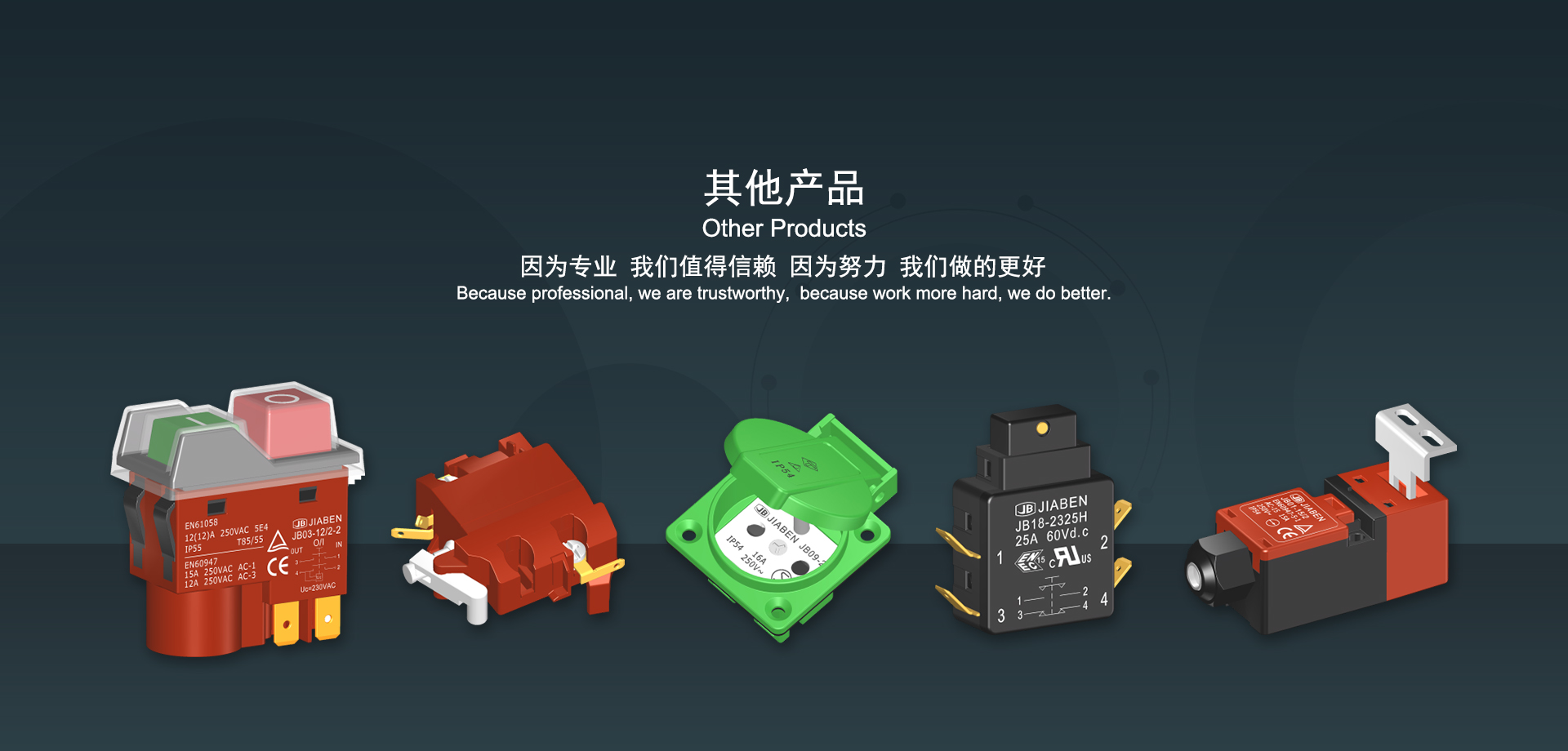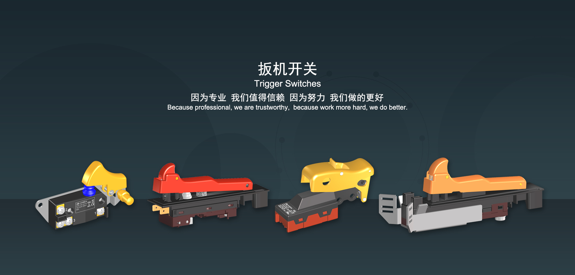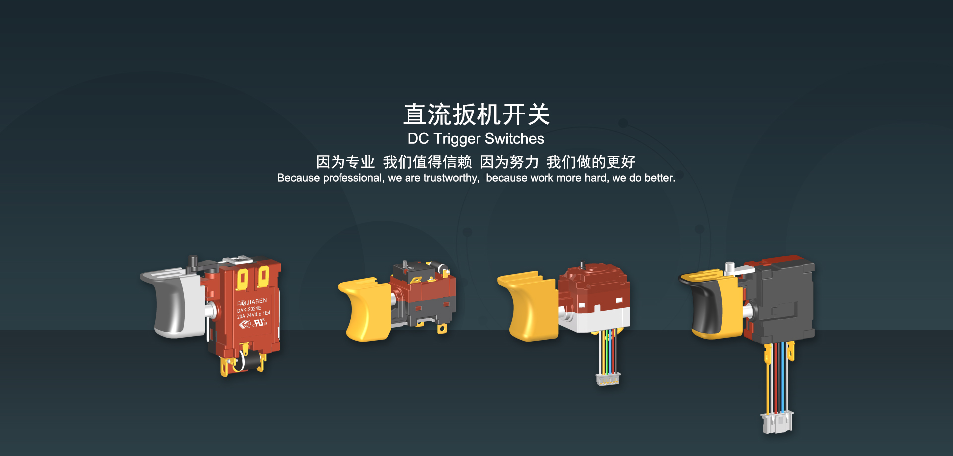 浙江佳奔電子有限公司始建于1986年,坐落于浙江省樂(lè)清市虹橋鎮(zhèn)東電子信息產(chǎn)業(yè)園內(nèi),現(xiàn)有職工700多人,資產(chǎn)總額超3億元。公司主要經(jīng)營(yíng)“JIABEN”牌微動(dòng)開(kāi)關(guān)、蹺板開(kāi)關(guān)、按鈕開(kāi)關(guān)、扳機(jī)開(kāi)關(guān)、調(diào)速開(kāi)關(guān)和電位器開(kāi)關(guān)等各類(lèi)交、直流器具開(kāi)關(guān)和各類(lèi)交、直流線(xiàn)路板模塊等產(chǎn)品,主要應(yīng)用于交、直流電動(dòng)工具、電動(dòng)園林工具、清潔器具、家用電器和小型機(jī)床等行業(yè),是集產(chǎn)品設(shè)計(jì)、研發(fā)、制造、銷(xiāo)售和服務(wù)于一體的國(guó)家高新技術(shù)企業(yè)。JIABEN was founded in 1986, located in East Electronic Information Industry Park, Hongqiao Town, Yueqing City, Zhejiang Proviance, existing staff more than 700 peoples, more than 300 million RMB worth of assets. Company is mainly engaged in "JIABEN" brand Micro Switch, Rocker Switch, Push-button Switch, Trigger Switch, Speed Regulating Switch, Potentiometer Switch and other kinds of appliance switch and all kinds of AC or DC circuit board module, such as more than 100 series, 8000 kinds of models of products, mainly used in AC or DC Power-tools, Power Gardening Tools, Cleaning Appliances, Household Appliances and Small Machine Tool and other industries, is the collection product design, research and development, manufacturing, sales and service in one of the national high and new technology enterprise.
